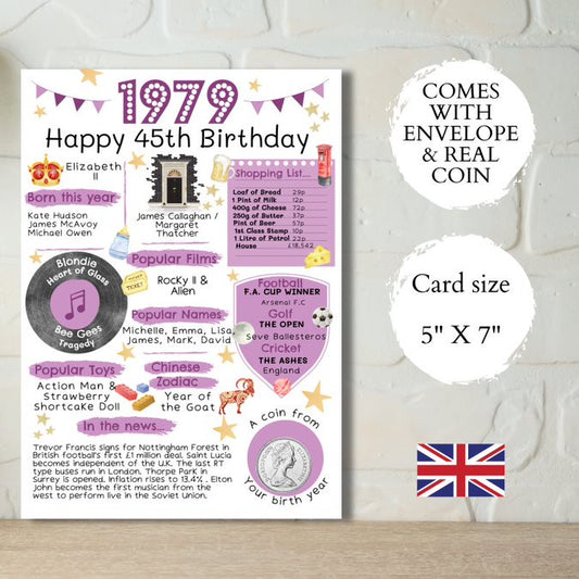 45th Birthday Card With A 1979 British Coin Choose Your Card Colour